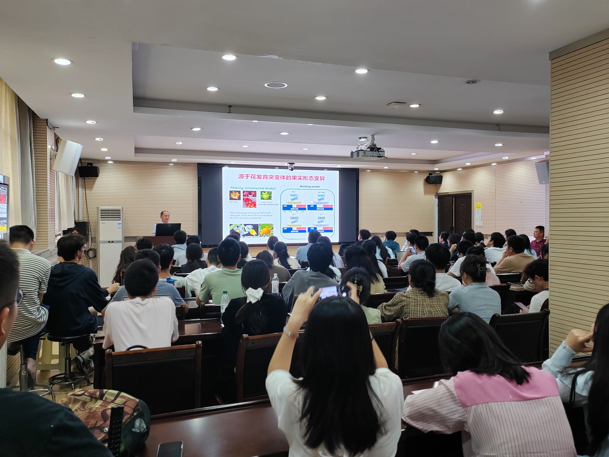 首先,由肖略研究员带来了题为《番茄果实形态的遗传和转录调控》的报告。肖略研究员现任中国科学院植物研究所研究员,长期从事番茄果实发育调控的研究。他详细介绍了番茄果实形态的关键基因调控机制,尤其是锌指蛋白在果皮细胞大小中的作用,并分享了实验团队近年来在番茄果实形态变异及遗传调控方面的突破性进展。报告内容充实,引发了与会师生对作物基因调控和果实形态改良应用的浓厚兴趣。报告结束后,现场气氛热烈,师生们围绕基因转录调控技术在农业中的应用展开了积极讨论。